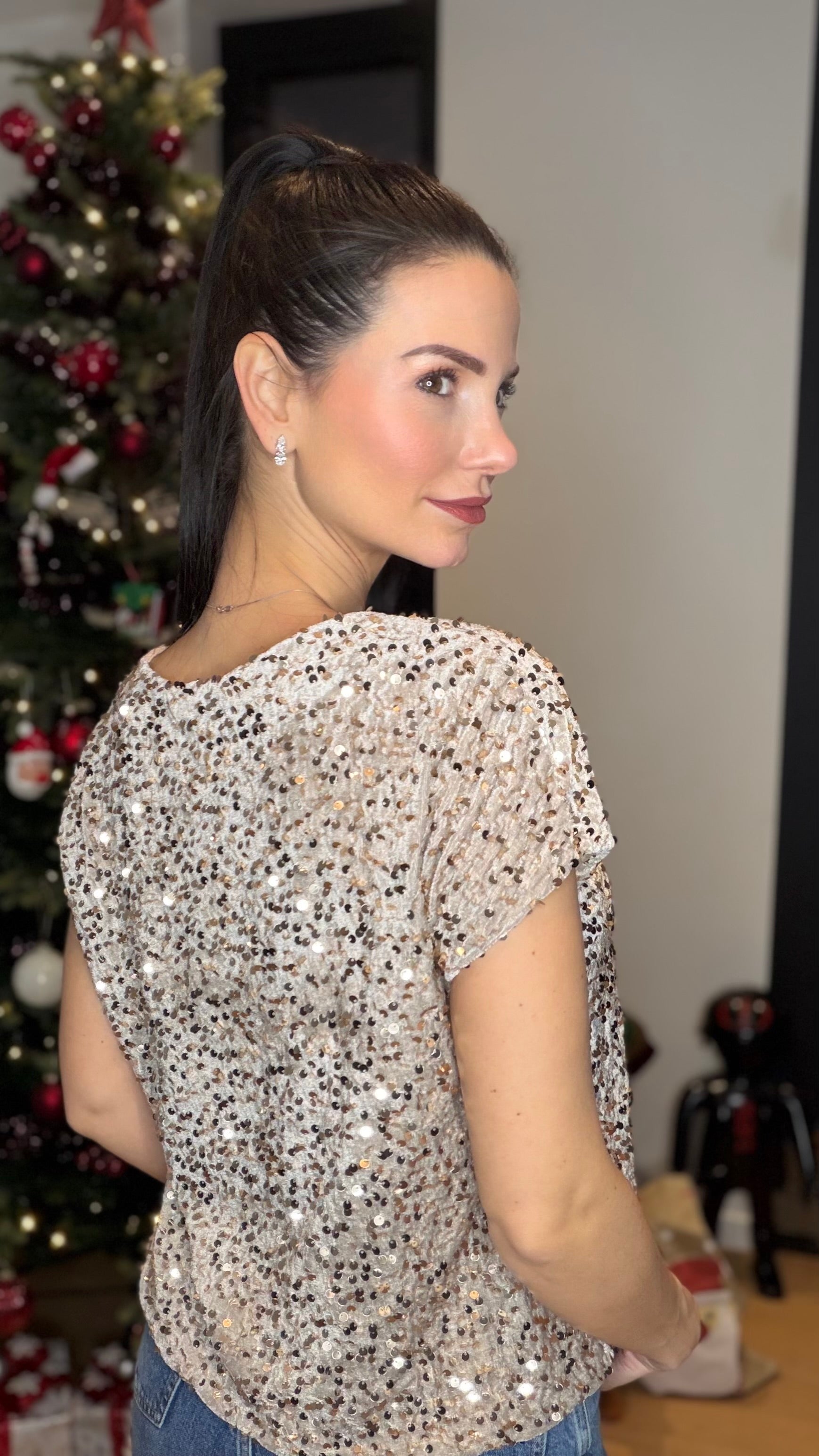 - T-shirt en velours beige entièrement recouvert de sequins