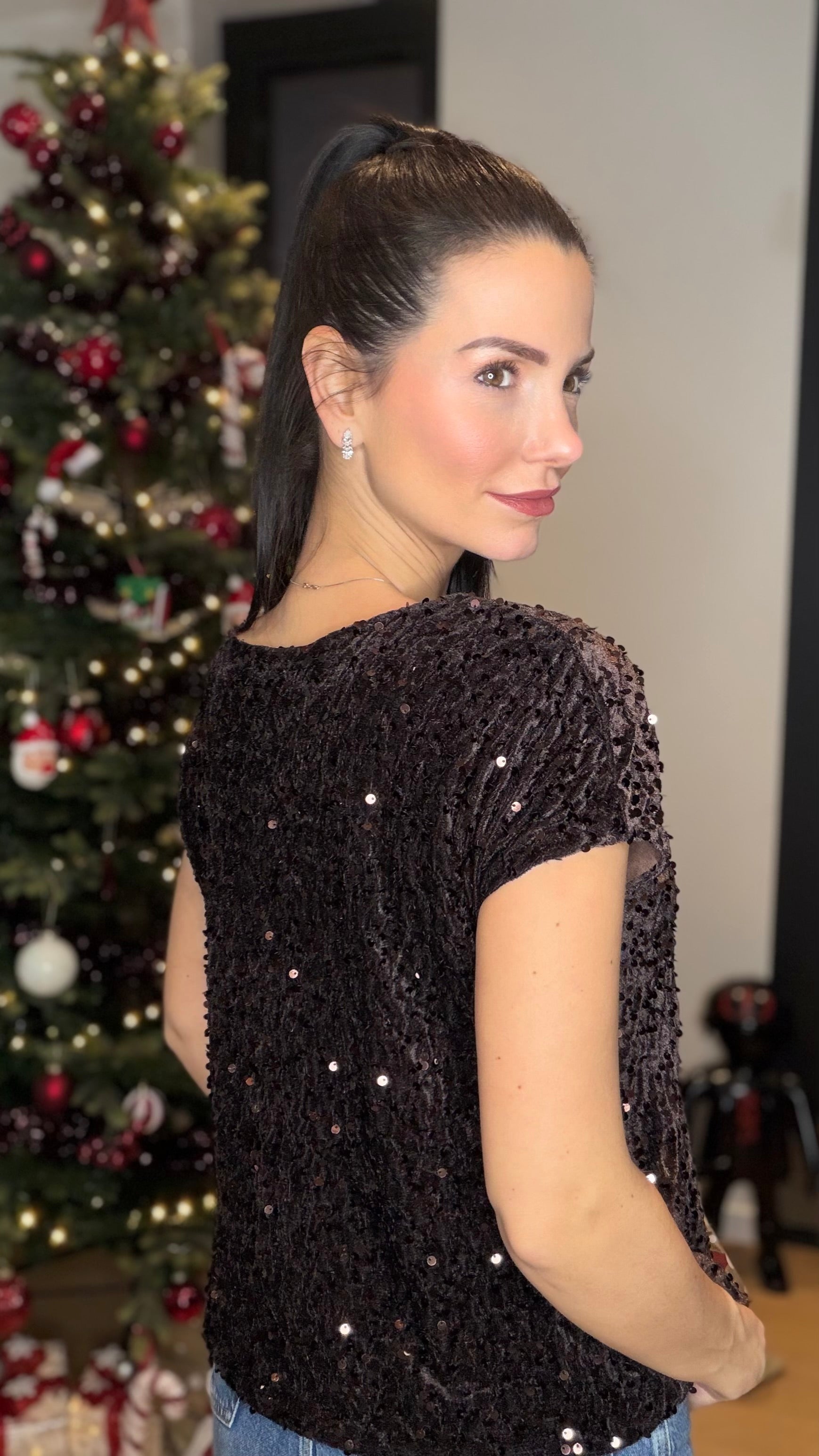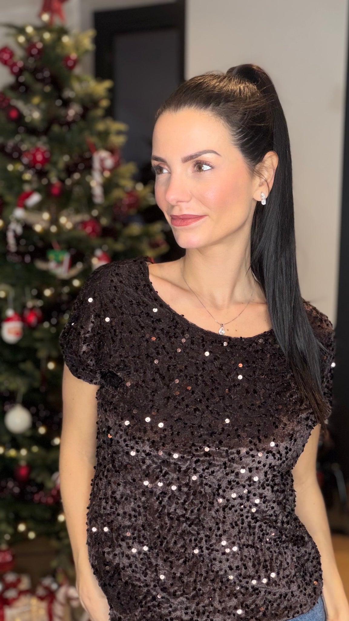 T-shirt en velours brun entièrement recouvert de sequins Col rond et manches courtes Coupe dro...
