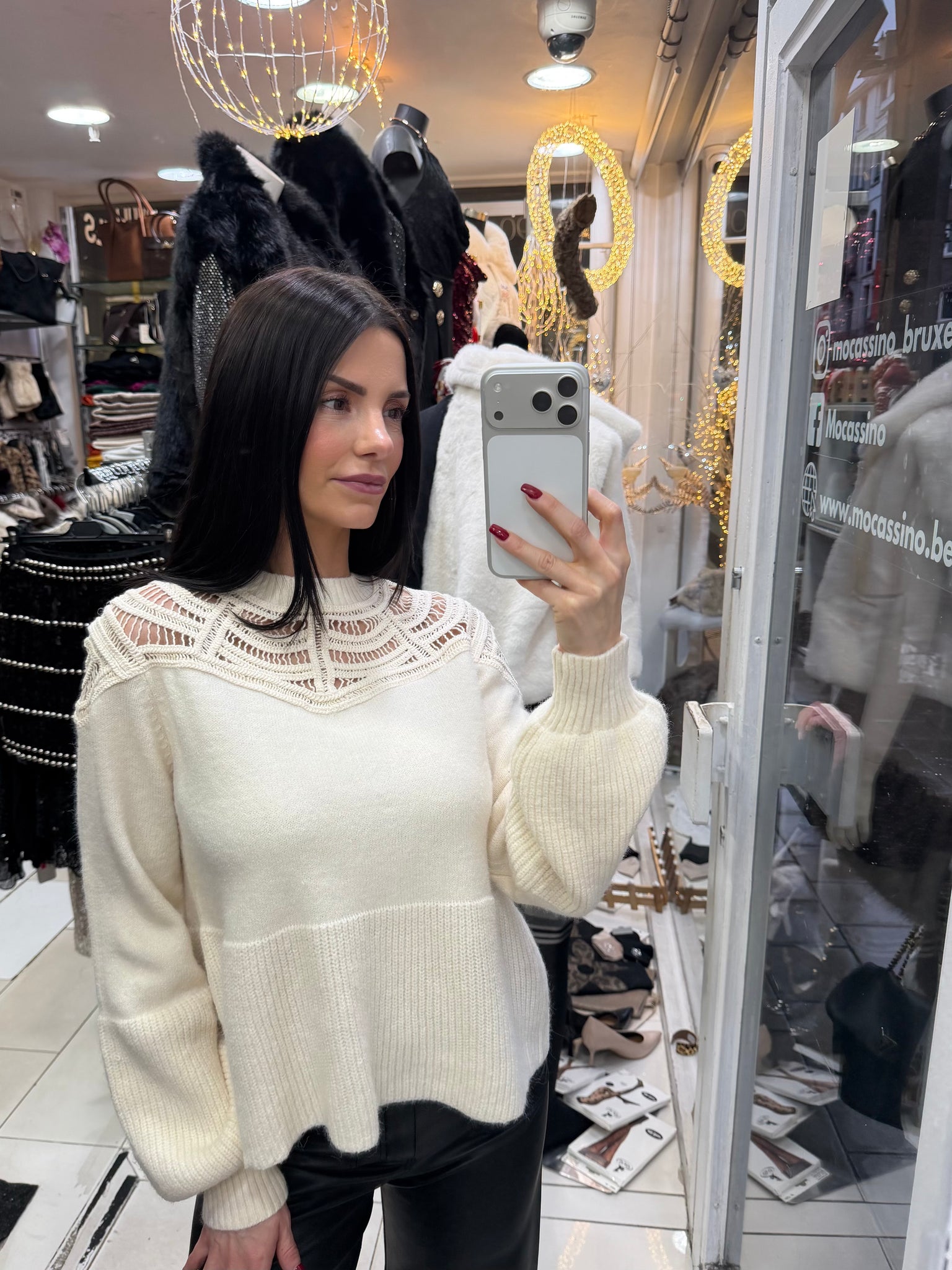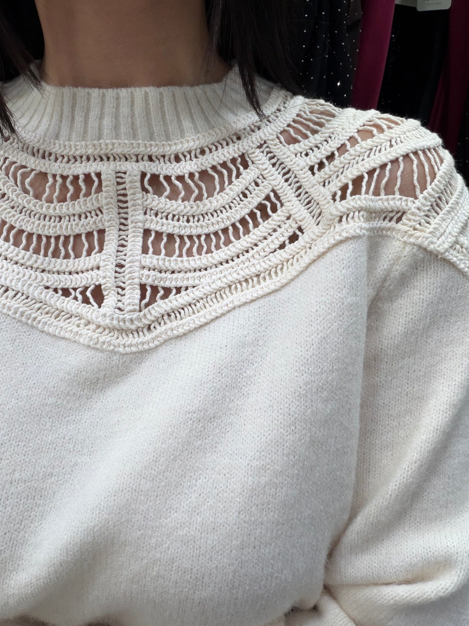 Couleur : crème Taille unique : convient du 34 au 44 Col montant en maille côtelée Détail dent...
