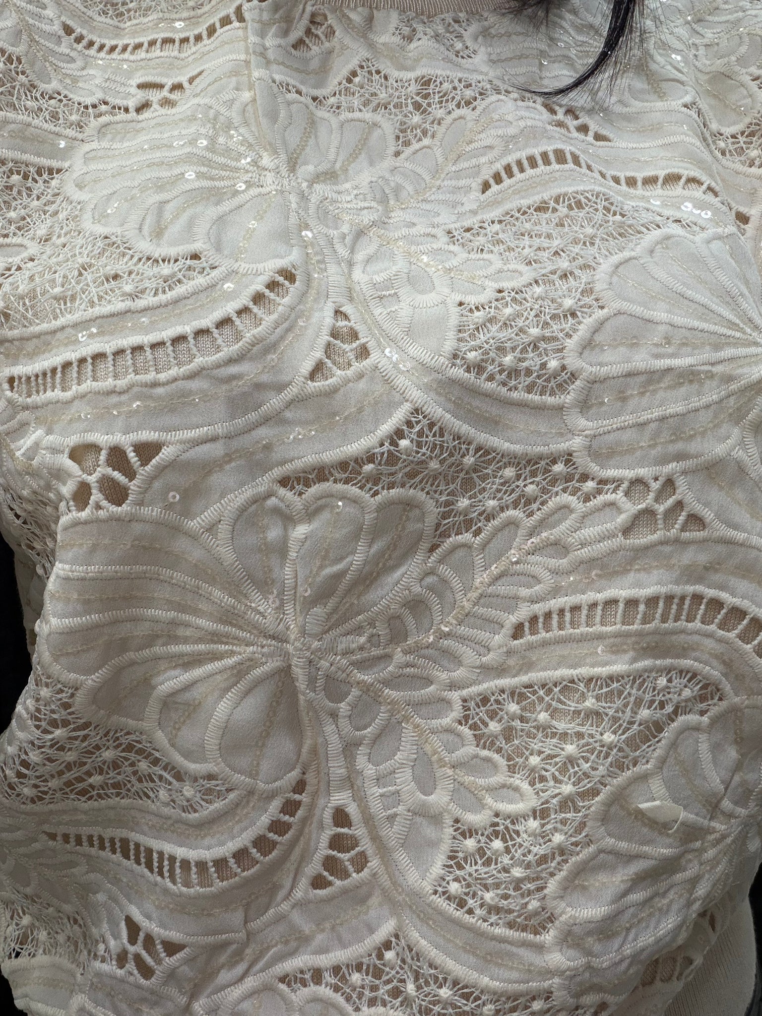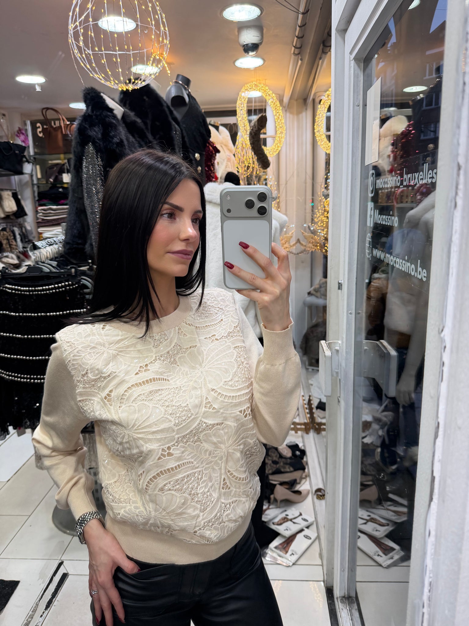 - Devant en dentelle travaillée : motif floral ajouré très élégant