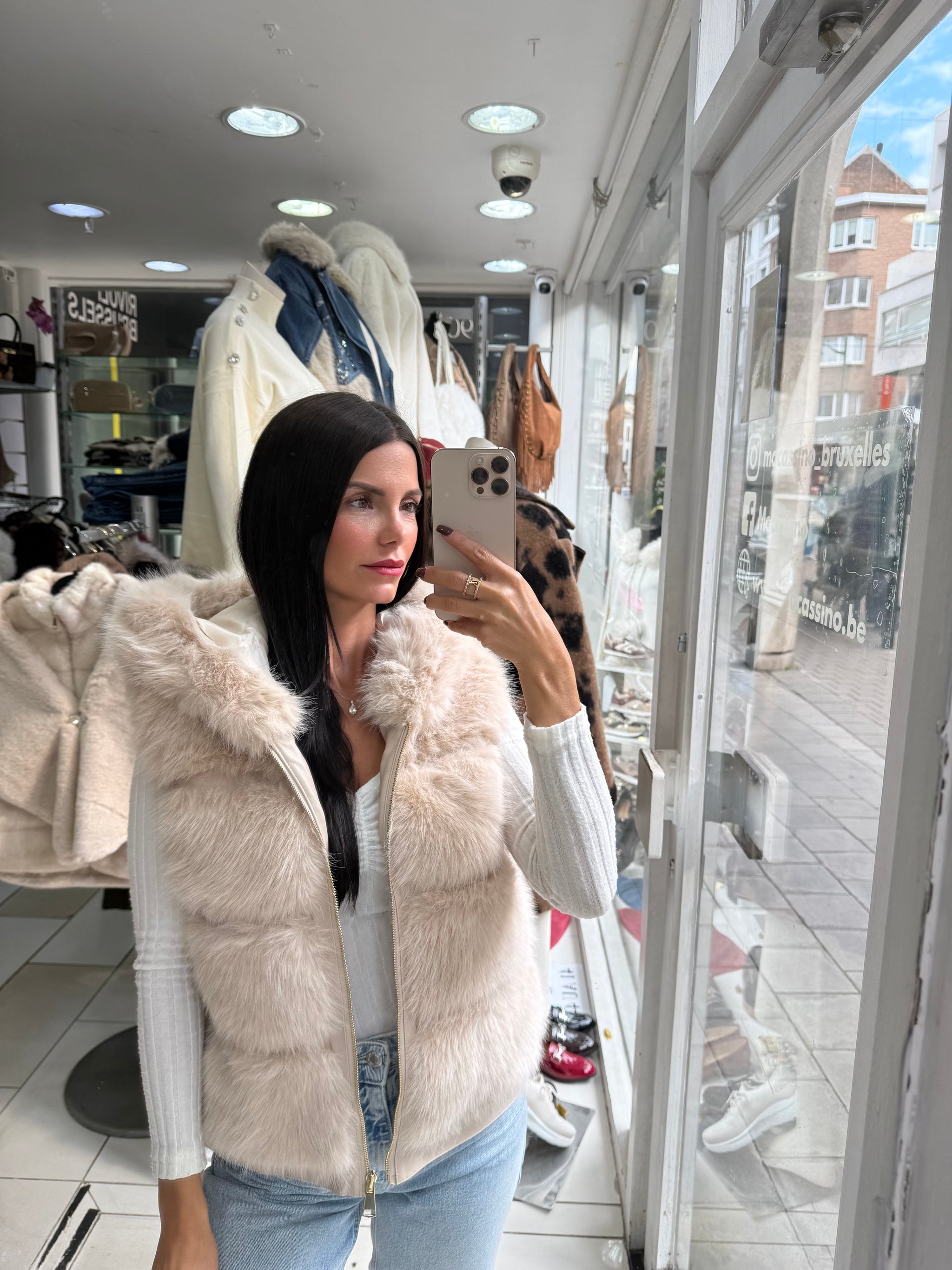 - Matière : fausse fourrure douce dans une teinte nude/beige rosé ultra raffinée.