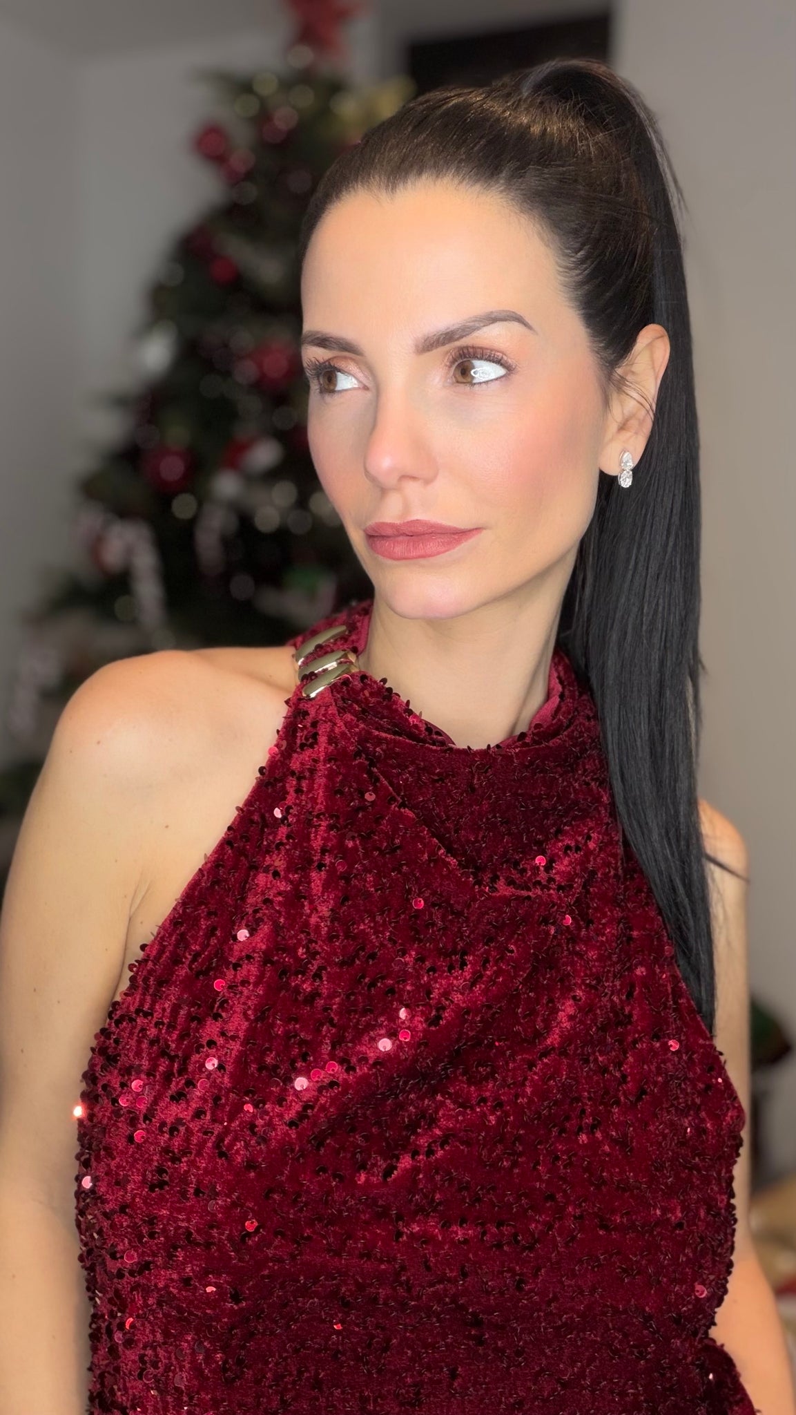 Top sans manches en velours recouvert de sequins Coloris bordeaux Col halter drapé avec boucl...