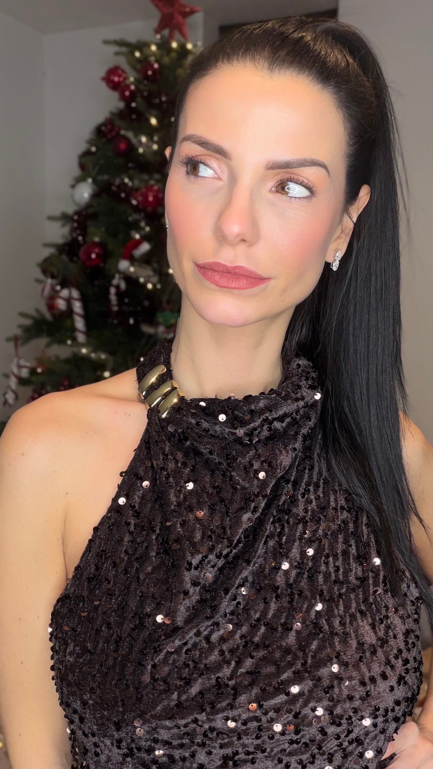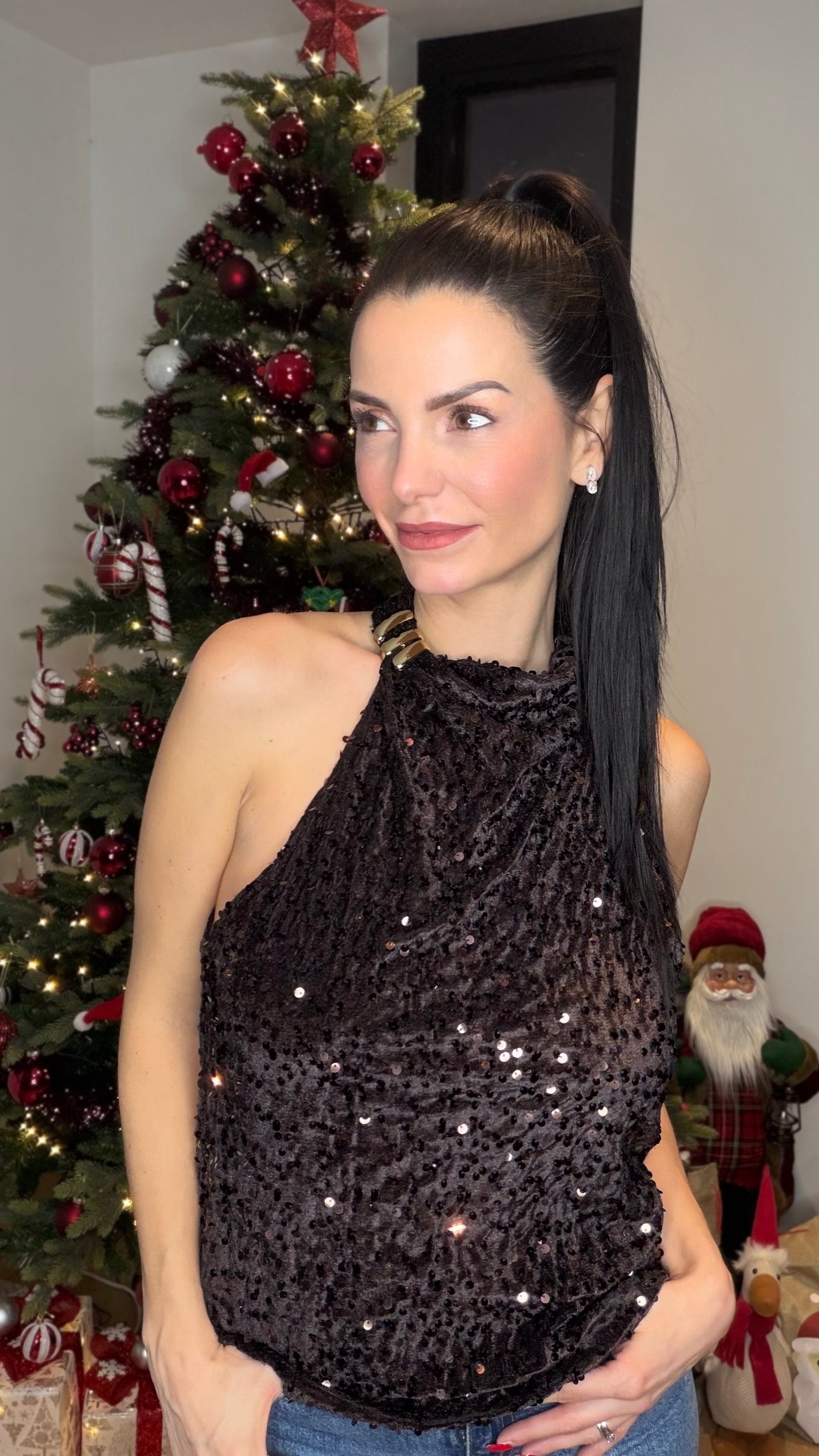 Top sans manches en velours recouvert de sequins Coloris marron chaud Col halter drapé avec bo...