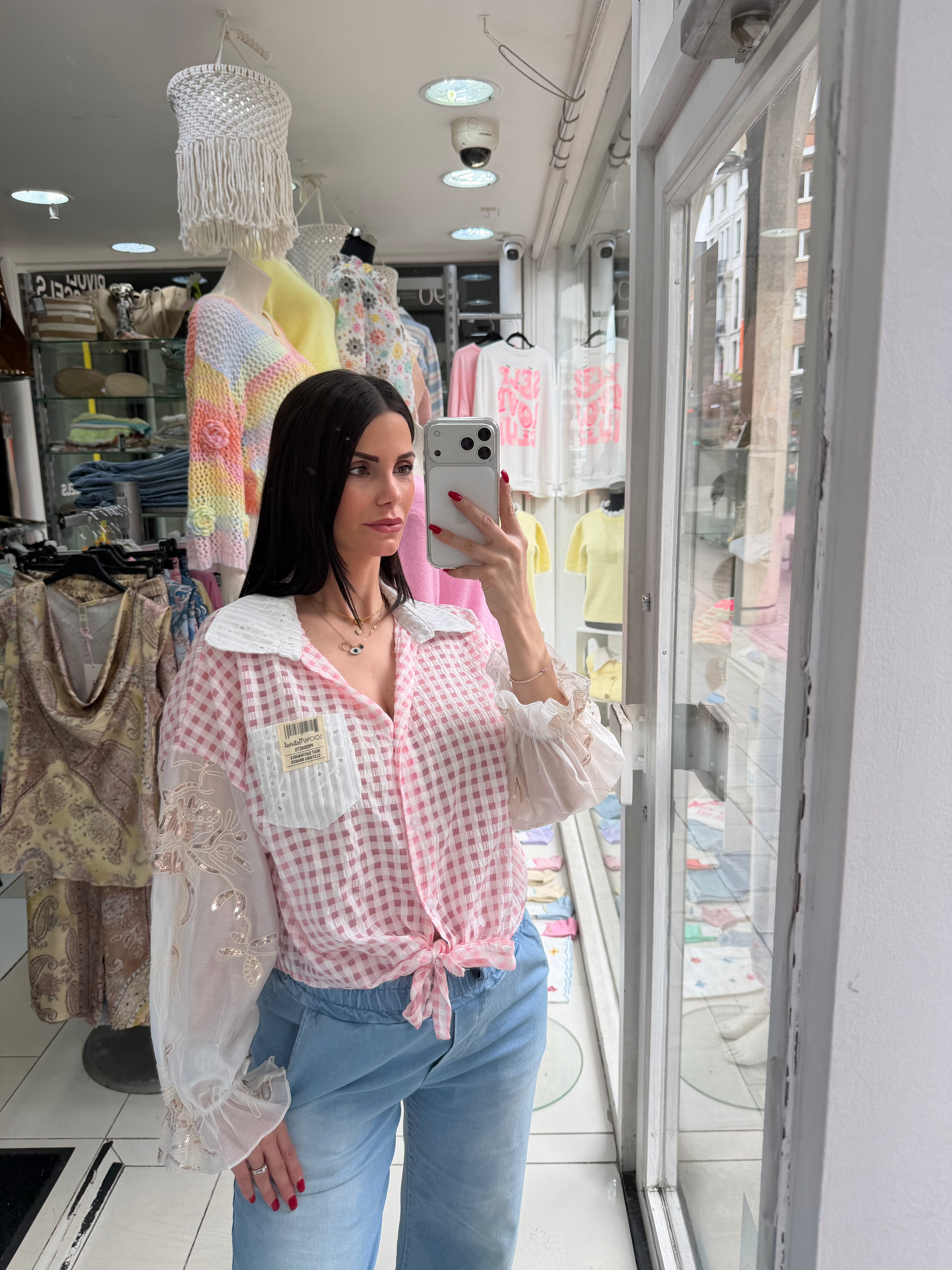 Chemise légère et féminine à carreaux roses et blancs, avec col blanc structuré qui apporte une touche chic.
