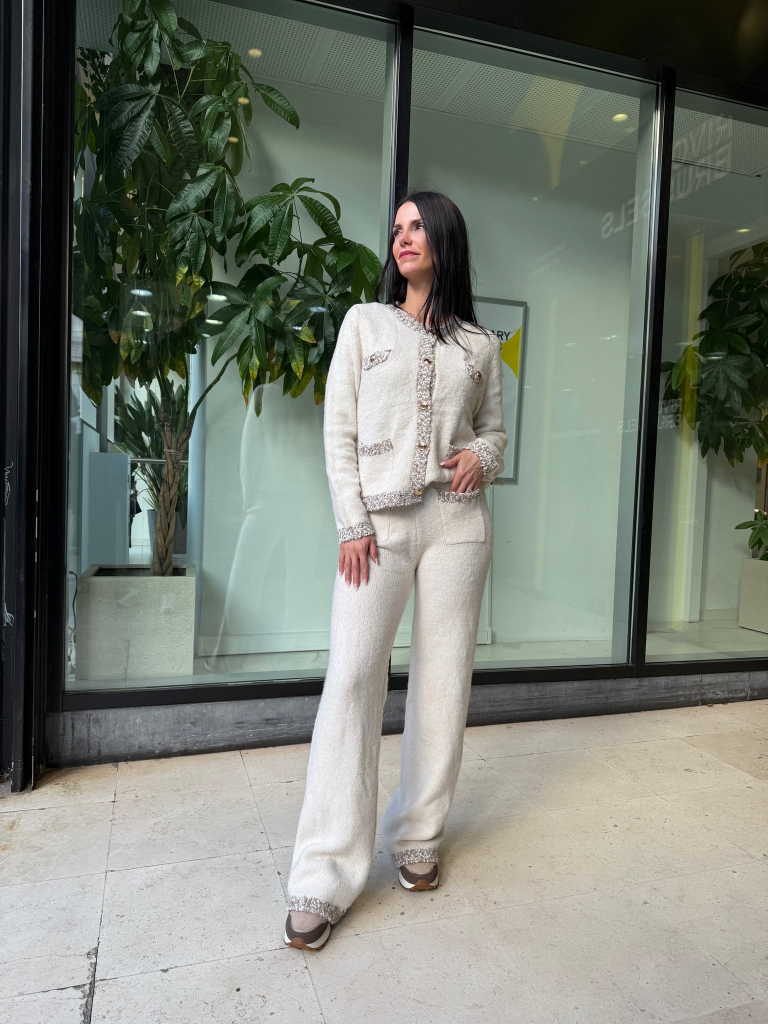 • Détails bouclette beige clair contrastants sur la veste et le pantalon