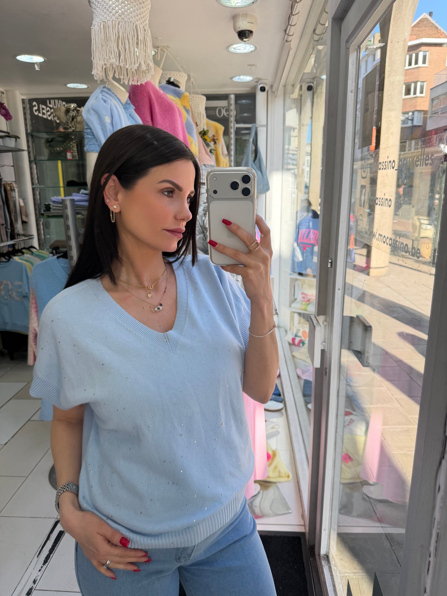 Taille unique : 36–44 Pull en maille fine Col V Coupe légèrement ample Manches courtes Maille do...
